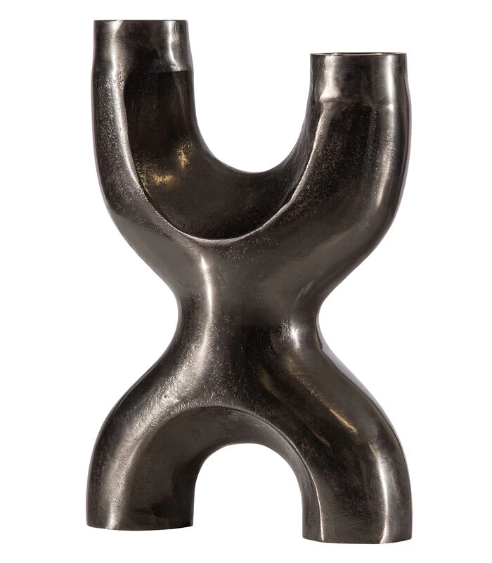 Deze grove kaarsenstandaard, van het Nederlandse merk WOOOD, met zijn robuuste design is een ware blikvanger in huis. De organische X–vorm is fraai afgewerkt en heeft een stabiele stand op de twee poten. De poten hebben een hoogte van 5 cm en een doorsnede van 6 cm. Plaats ter bescherming van het oppervlakte viltglijders onder de poten. De Don kaarsenstandaard is vervaardigd uit ruw aluminium wat van origine al zwart is. Voor het beschermen en het verlengen van de levensduur is de kaarsenstandaard gecoat met een dun laagje zwarte nikkel, hierdoor is Don kras– en slijtvast en hittebestendig.