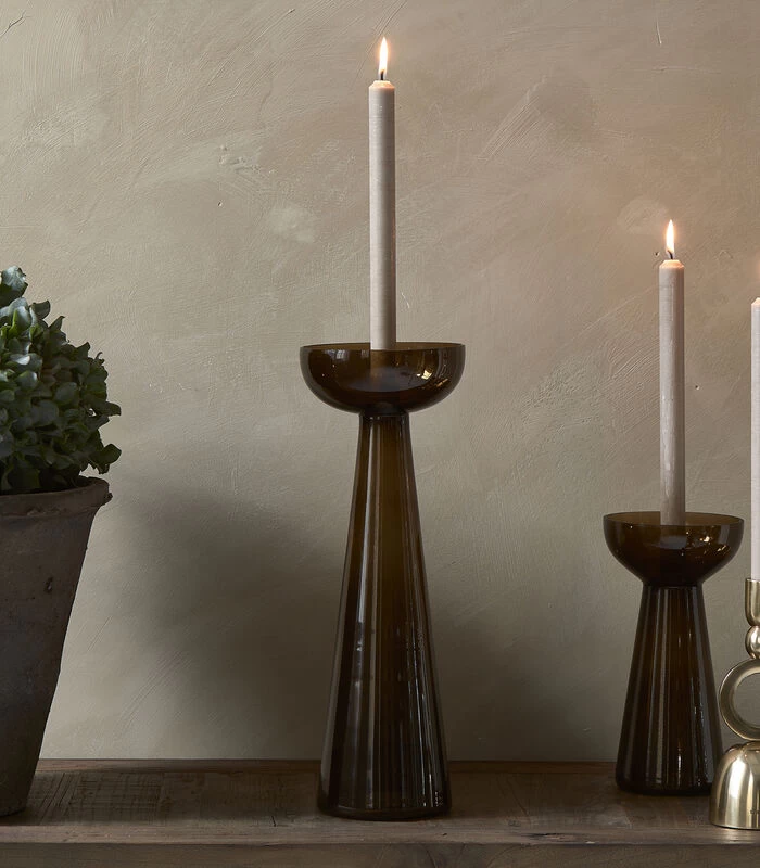 Rank en slank, en daardoor uiterst stijlvol, de RM Amber Stone Candle Holder L. Het iconisch glas loopt smal naar boven, in de schaal die daar bovenop staat, is een uitsparing gemaakt voor een tafelkaars. Met aangestoken kaars krijg je zo een prachtig effect.