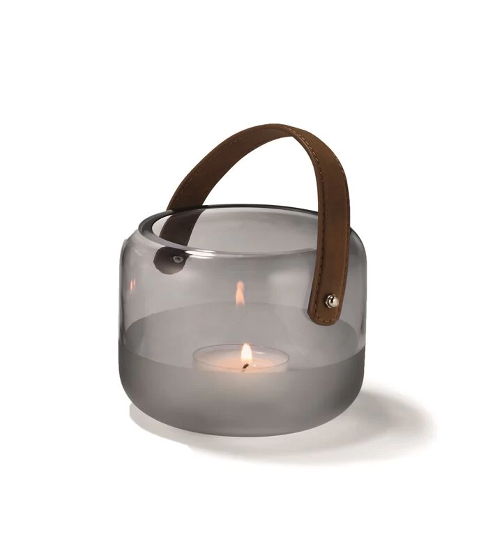 Materiaal: Mondgeblazen glas, donker grijs, handgreep van echt leder