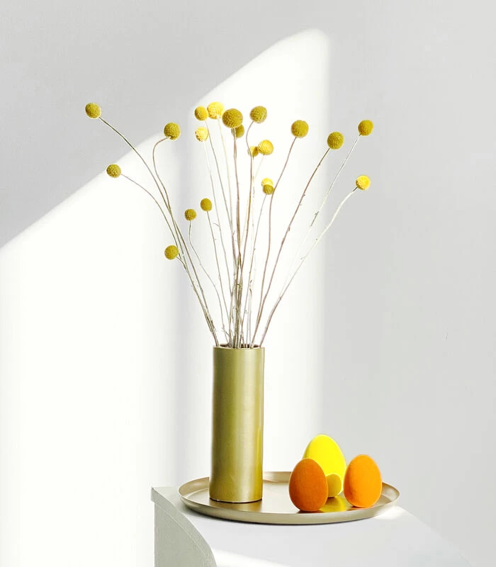 Vazen worden doorgaans gemaakt uit glas of porselein. Noella daarentegen is handgemaakt uit staal, bedekt met een laagje zacht koper, mat zwart of matte messing. De kleuren van de vaasjes maken elke bos bloemen tot een ware eyecatcher.