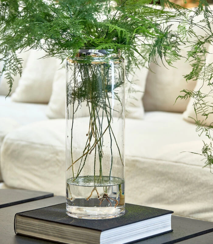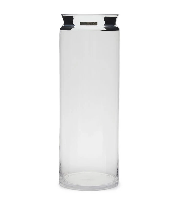 De RM Odalisque Vase silver is een cilindervormige bloemenvaas van helder, transparant glas. Het hoge glas is aan de bovenkant afgewerkt met een zilverkleurige folie. Op de folie is een label te zien met ‘Rivièra Maison’. De slanke vaas heeft een geschulpte rand.