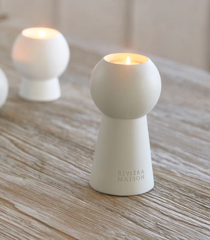 De grote RM Oriental Pearl Votive L torent boven andere theelichthouders uit. Logisch, zijn voet is behoorlijk hoog. De houder is gemaakt van polyresin, in de mooie, naturel/flax kleur. Hij heeft twee kleinere broers met wie hij een leuk trio vormt, maar alleen voelt hij zich ook uitstekend.