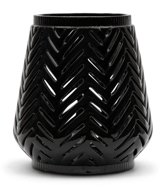 De RM Herringbone Hurricane black is een zwart windlicht met een mooie glans. Dit komt door de glazuurlaag die op het keramiek is aangebracht. De grote kaarshouder heeft een visgraatpatroon. Door de openingen kan het kaarslicht sfeervol naar buiten schijnen. Op de bodem van het windlicht staat ‘Rivièra Maison’ geschreven.