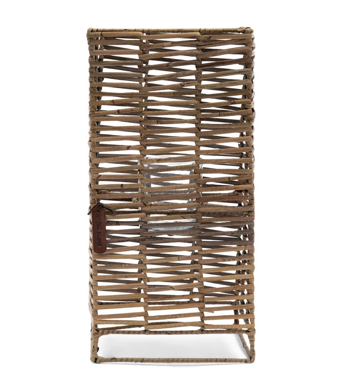 De RR Plaisance Hurricane is een groot windlicht. Het frame van de kaarsenhouder is met de hand gemaakt en omwikkeld met rustic rattan en peeled rattan, twee materialen in natuurlijke bruintint. In het midden van het windlicht is een glazen houder voor de kaars geplaatst.